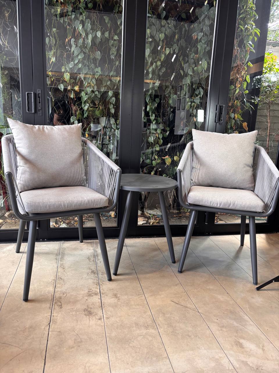 The chairs are built with a sturdy, powder-coated aluminium frame and wrapped side detailing for a sleek, architectural look. Soft, neutral-toned cushions provide excellent comfort while remaining durable and easy to maintain. The compact side table completes the set, offering a practical surface for drinks, books, or décor.